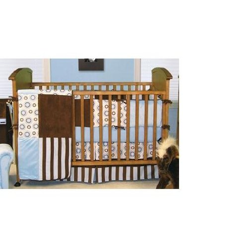 The Blueberry 4-Piece Crib Bedding Set by Trend Lab features a modern color combination just perfect for today's nursery. The combination of blue with chocolate and caramel in motifs of open circles and dots with tonal awning stripes is simply perfect. This themed set features a framed quilt, 4-piece bumper, crib skirt and sheet.