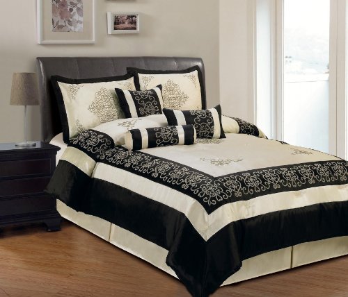 Read more Elegant 7 Piece Beige and Black Faux Silk Embroidered and Flocking Comforter Set, Queen