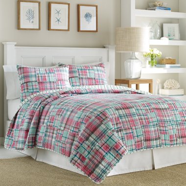 A soft cotton quilt sporting vibrant shades of pink and turquoise that add a refreshing update on a classic plaid.