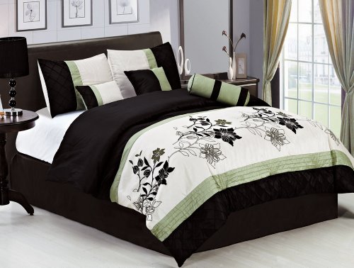 Read more 7 Piece Queen SAGE GREEN/BEIGE/BLACK Pin Tuck Bed in a Bag Flock Comforter Set