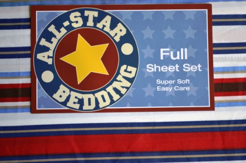 All Star Bedding Complete 4 piece FULL Microfiber Sheet Set. Striped pattern with navy and light blue, tan, burgandy, brown and white. Narrow and wide stripes complement this bold pattern. Great for that person who likes some color in their bedding. Set comes with 1 flat sheet 81 x 96 inches, 1 fitted sheet 54 x 75 + 12 inches, 2 standard pillow shams 20 x 30 inches. Machine wash in cold water, tumble dry low and remove promptly. Wash before using. NO Bleach.