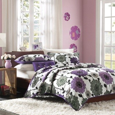 MZ80-053 Size: Full / Queen Features: -Material: Polyester microfiber.-Cotton filled quilt.-85GSM.-Can fit twin and twin extra long mattress.-Print floral. Includes: -Twin size includes quilt, sham and decorative pillow.-Full / Queen size includes quilt, 2 shams and decorative pillow. Color/Finish: -Color: Purple.-Sham backing to add more color and dimension to this bed set.