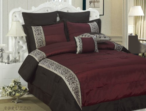 Embroidered Faux Silk 8-piece Top of Bed Abruzzo Decorator Bed Set. 100-percent Polyester material-pieced together for a very classy look. The queen set includes a 86 by 86 comforter in rich burgundy and black tones; a coordinated bedskirt with 14-inch drop; 2 standard size shams with 2-inch flange ; a 16 by 16 square decorator pillow; and a 12 by 16 decorator pillow - all in the same embroidered and color way as the comforter and 2 26 by 26 solid color euro shams