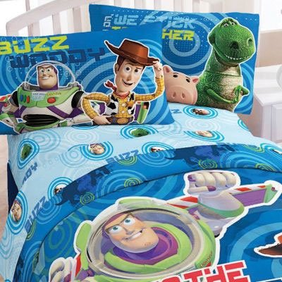 One Toy Story Circles Twin-single size comforter, flat sheet, fitted sheet, and one standard pillowcase. ... CONTENTS: One twin size comforter 66 x 86 in. (168 cm x 218 cm); One twin flat bed sheet, finished size 66 x 96 inches (168 x 244 cm); One twin fitted sheet. Both of the above sheets fit a standard twin mattress of 39 x 75 inches.; One standard pillowcase, finished size 20 x 30 inches (51 x 76 cm) to fit 20 x 26 inches pillow