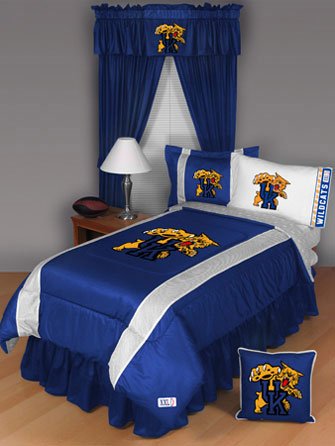 Pattern: NCAA Kentucky Wildcats. Genuine licensed merchandise. Machine washable. One queen size comforter 86 x 86 inches (218 cm x 218 cm). One queen flat bed sheet, finished size 90 x 102 inches (229 x 259 cm). One queen fitted bed sheet. Both sheets fit a standard queen mattress of 60 x 80 inches (152 x 203 cm) Two standard pillowcases (the white ones in the picture), each fit 20 x 26 inch (51 x 66 cm) pillows. Sheets are white. They do not have the team logo. Only pillowcases and comforters have team logos. This sale is only for the items described. Other items pictured are for illustration only.