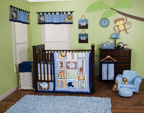 1-2-3 learn and play with me! Trend Lab's Jungle 123 3-Piece Crib Bedding Set combines cute jungle animals with ABC's and 123's. The modern tiled layout, beautiful color palette and soft navy corduroy trim sets this jungle themed collection apart from the rest. Chevron, dot, stripe, triangle, and onion prints add trend-right detailing while shades of cornflower blue, chocolate, caramel, aquamarine, buttercup, celery, pistachio and navy create the most enjoyable and colorful jungle nursery around!