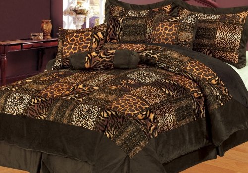 Read more 7 Pcs Micro Fur Brown Leopard / Giraffe / Zebra / Tiger Patchwork Queen Comforter Bed In a Bag Bedding Set