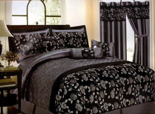 Read more 7 Piece Bed In A Bag, CORNELIA Black / Silver Gray / White FAUX SILK Comforter Set - Queen Size Bedding