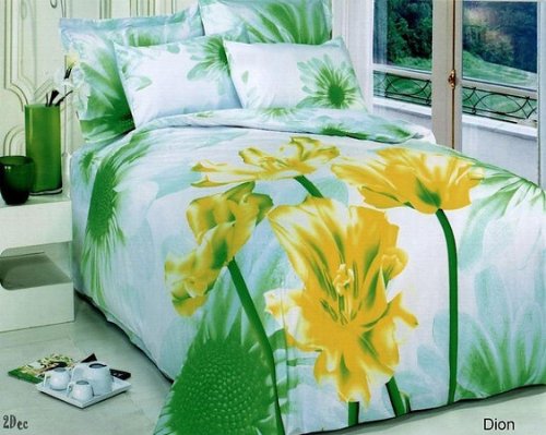 - A 3D effect is painted with yellow lilies, green sunflowers and other floral prints in various shades of depth on a white background.