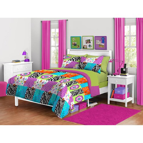Read more Girl Black Pink Green Purple Supersoft Zebra Flower Patchwork Full Queen Comforter Set (3pc)