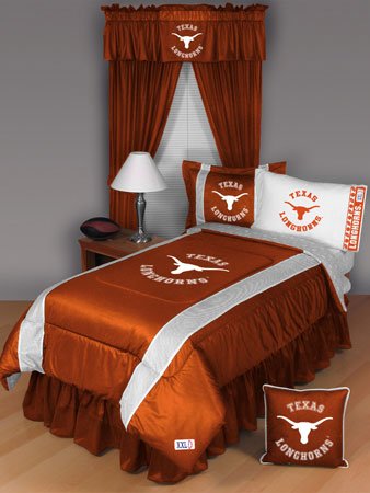 Pattern: NCAA Texas Longhorns. Genuine licensed merchandise. Machine washable. One queen size comforter 86 x 86 inches (218 cm x 218 cm). One queen flat bed sheet, finished size 90 x 102 inches (229 x 259 cm). One queen fitted bed sheet. Both sheets fit a standard queen mattress of 60 x 80 inches (152 x 203 cm) Two standard pillowcases (the white ones in the picture), each fit 20 x 26 inch (51 x 66 cm) pillows. Sheets are white. They do not have the team logo. Only pillowcases and comforters have team logos. This sale is only for the items described. Other items pictured are for illustration only.