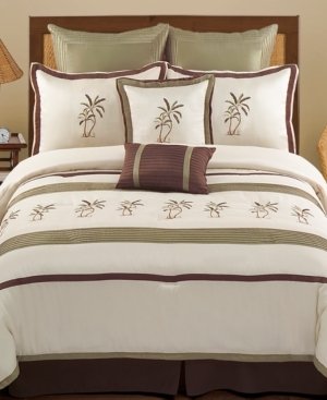 ***NEW*** Beach beauty. Embroidered palm trees, clean lines and pleat details invite sophistication into your home with the Montego Bay comforter set. Featuring clean, soothing shades for year-round style. Polyester Machine washable Imported Set includes comforter, bedskirt, two standard shams, two European shams and decorative pillows Comforter measures 80" x 90" Light tape residue on comforter, faint red mark which appears to be makeup/ should clean well New in open package